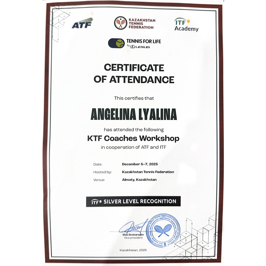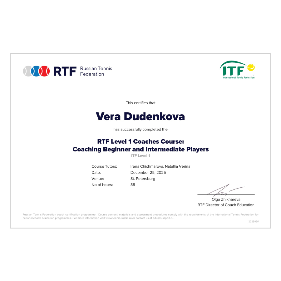 Сертификация тренера ITF Level 0 (работа с детьми от 4-6 лет ) диплом, Level 1 диплом (работа с ведущими юниорами 9-13 лет), Level 2 диплом (работа с ведущими юниорами 14-16 лет).